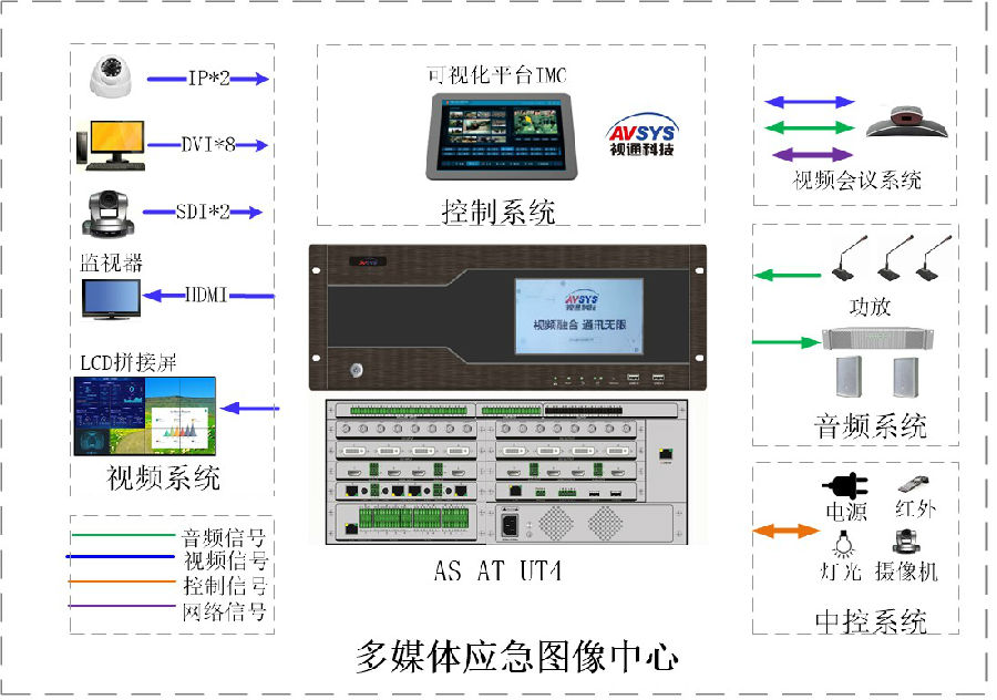 应急中心采用milan.com米兰科技自主研发的高度集成综合一体化主机AS-UT4,具备视频矩阵和拼接管理、安防监控管理、音频管理、录制及回放管理、中控外部设备管理、外围视频会议终端和主机自带视频会议双备份管理、可视化综合管理平台管理等功能。项目实现应急中心应急指挥保障、上下级单位视频会议的统一调度与管理。